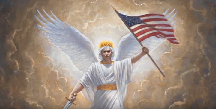While Washington observes the chaotic attack, the woman in white speaks again saying, "Son of the Republic, look and learn." He then saw an angel wearing a white robe like the woman but wearing a crown with the word "Union" written in gold lettering. In one hand he's carrying a sword and in another he's holding an America flag.
