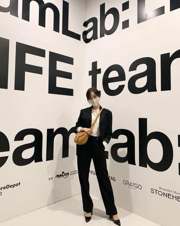 No exception when using a mask, Yoona still looks beautiful and fashionable with a black suit and the same colored pump shoes. This style from Ms. Yoona can be your outfit inspiration for the office!
