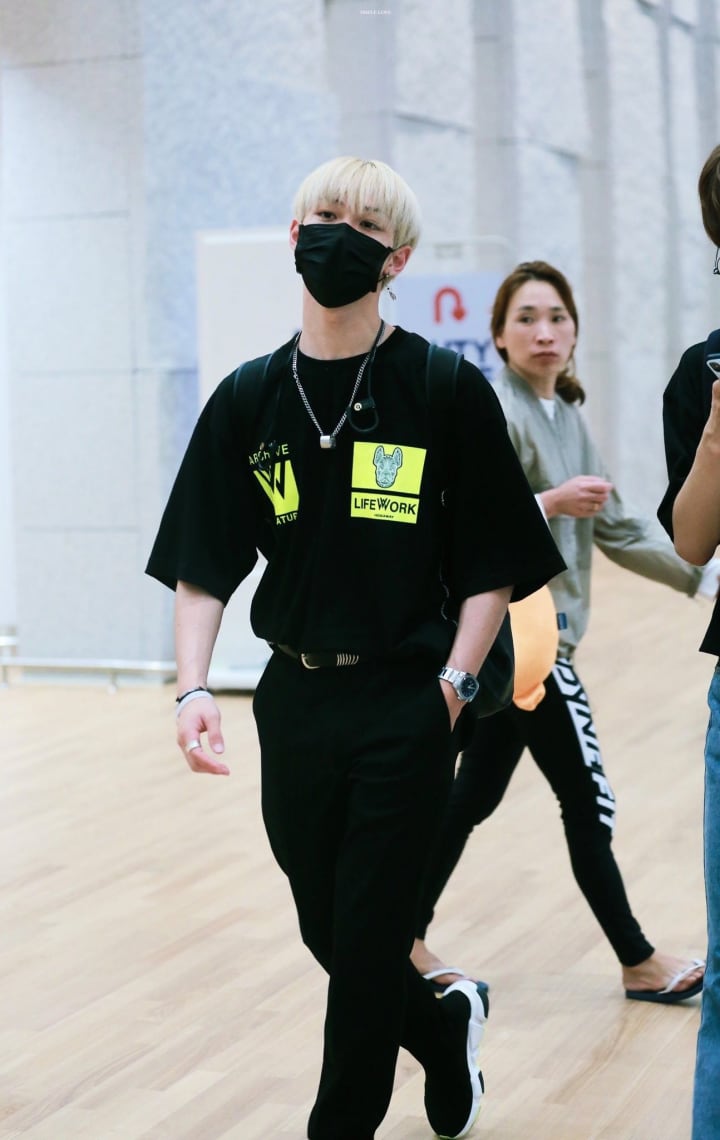 Street style with dark shades is shown by Felix from the group Stray kids. He was seen wearing a black oversize t-shirt tucked into the same colored chinos with the addition of comfortable sneakers.