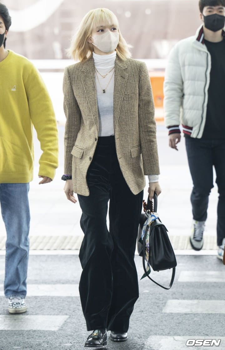 The member of the WJSN group looks beautiful in a floral shirt as an outer with a white crop top tee. Not forgetting Cheng Xiao wearing ripped jeans and a black mask to complete this airport fashion style.