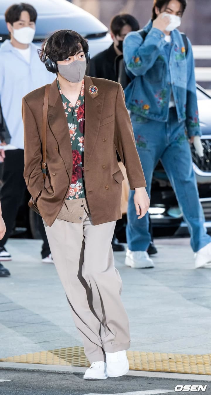 BTS V airport fashion has once again captivated the media! The reigning fashion king complemented his ensemble with a Dior Vintage jacket, a floral shirt by Japanese designer Undercover Jun Takahashi, a Chanel brooch, a Louis Vuitton shoe, and a Cartier watch.