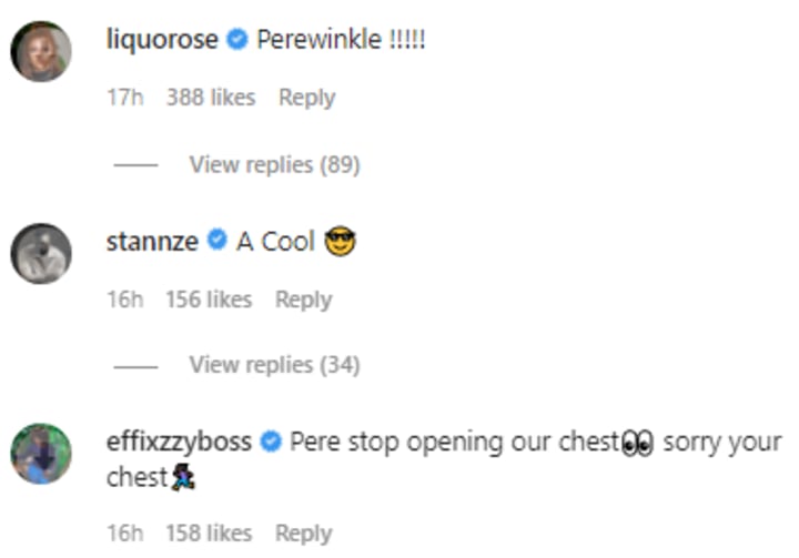 Reacting to the outfit, his fellow housemate Whitemoney commented saying, "Easy nawww🔥🔥", Wathoni said "FIA 😍😍", Liquorose said "Perewinkle !!!!! " and Effixzzyboss said "Pere stop opening our chest👀 sorry your chest"