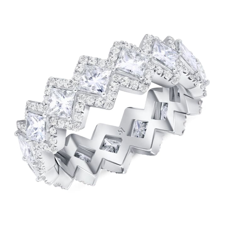 It is no secret that a diamond eternity ring is one of the best gifts that you can give to a woman regardless of the occasion. Further, this 3ct princess cut diamond ring features a total of 15 tiny diamonds decorated in a round melee. Further, the loop itself is made up of shiny white gold with a unique zig-zag design.