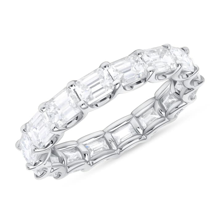 The Emerald Cut Eternity band is another unique product that has gained a lot of traction over recent months. The ring features a set of 16 diamonds that have an overall weight of around 3.15 CTW. Again, like the ring above, the Emerald Cut eternity ring is also available in a total of three color options.