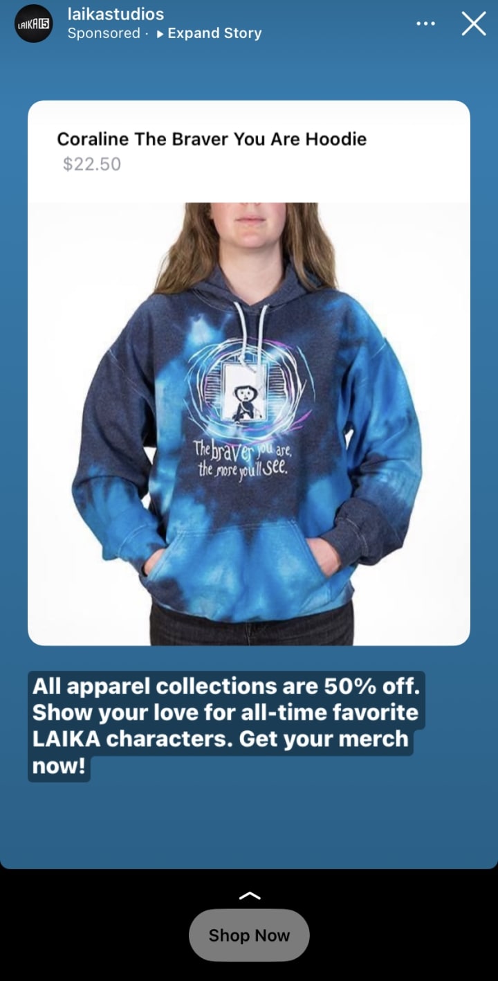 I honestly have had pretty bad luck with clothes I've been influenced to buy via ads on Instagram (mostly having to do with my lack of research into the sites themselves), but I really almost clicked through on this ad because it's CORALINE. And the 2009 film Coraline (based on the novel of the same name by Neil Gaiman) did not have much in the way of merchandise when it was first released. The film, however, has many steadfast fans who were likely clamoring for products related to the movie. Enter Laika Studios, the creators of the film, that have made some much-desired merch for the film available through their site's online shop. As of this writing, the above hoodie is so popular that it has sold out of all sizes except for X-Small, so I guess I may have another chance to get my own in the near future if I so desire...