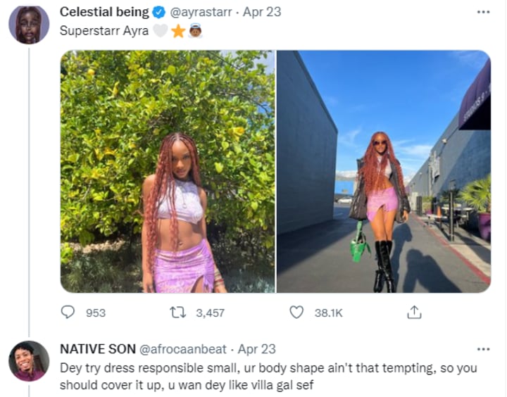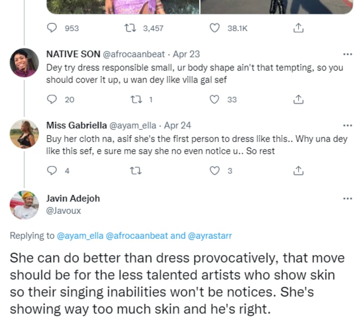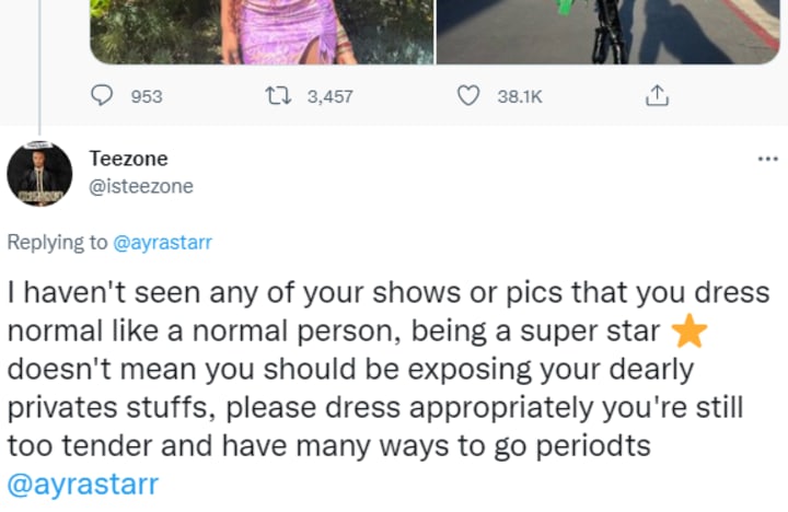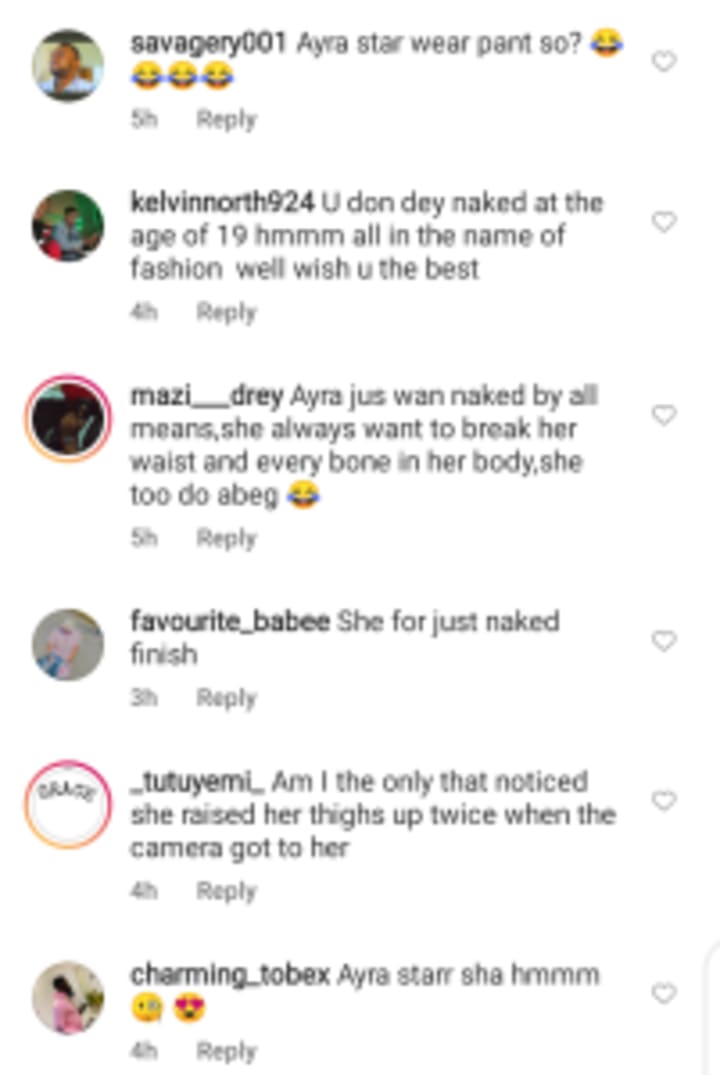 The outfit was immediately met with harsh criticism. Some of the comments include people saying, "U don dey naked at the age of 19 hmmm all in the name of fashion well wish u the best", "Ayra jus naked by all means, she always want to break her waist and every bone in her body, she too do abeg," "Wait o! Where is it written that as a female celeb, u should suddenly be naked?" Safe to say, this outfit caused a lot of conversation and not in a good way.