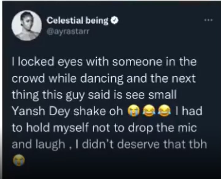 This one is a funny story. When Ayra Starr was performing in her little shirt and crop top, she started whining and as she was doing it, it was touching a man in the crowd so much so that he said "see small yansh dey shake oh", it almost made Ayra drop her mic. Here's what Ayra said: