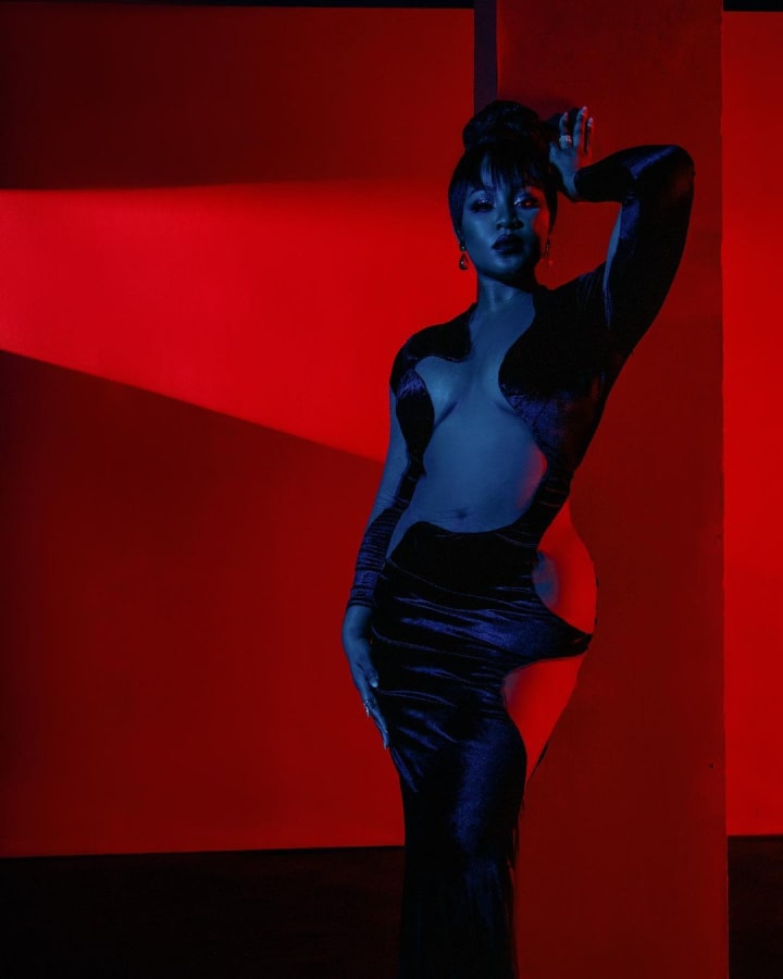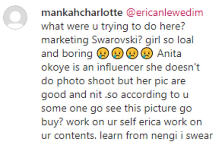 When Erica Nlewedim posted this picture online rocking an outfit that is similar to the one American rapper Cardi B wore on the album cover of her album Invasion of Privacy, people were quick to come for the actress and their comments were brutal! One person said, "erica be like that my papa sister the year 1962" while another said “Omg Erica looks ridiculous”. In fact, one person went ahead to do a side by side comparison of Erica beside Cardi b calling Cardi's outfit "Grammy style" and Erica's "Grandma style"