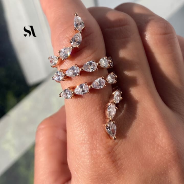 This ring has been created, keeping the changing preferences of people in mind. Unlike the round-shaped traditional rings, the pear diamond ring has a spiral shape, and carries around 18 stones. The sparkle of these diamonds complements the gold metal perfectly. Hence, the ring can be an ideal choice for your weekend trips and wedding ceremonies.