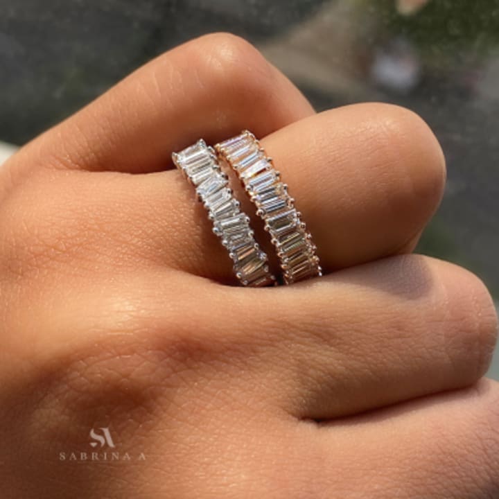 Bored with the regular traditional band, want to try something new? Here is the Zig Zag Baguette Eternity Band that can enrich your fashion sense like never before. The baguette eternity band features rectangular-shaped diamonds on the gold plate in a ZigZag fashion, which presents an appealing look to your entire fashion setup. The band is available in three different color options, such as White Gold, Rose Gold, and Gold.