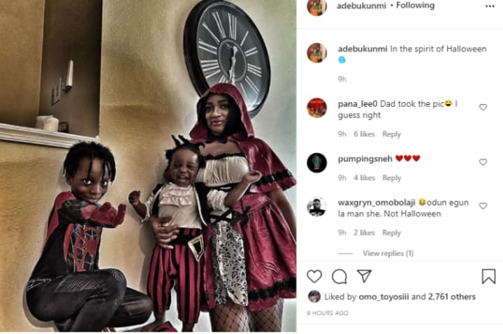 While prominent Nigerian rapper, Olamide, didn’t get into the festivities himself this year, his family sure as hell did. Olamide's partner, Adebukunmi took to Instagram to share pictures of herself and kids all dressed up for Halloween. A really cute family picture I must say.