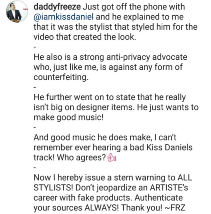 Just got off the phone with @iamkissdaniel and he explained to me that it was the stylist that styled him for the video that created the look. Now I hereby issue a stern warning to ALL STYLISTS! Don’t jeopardize an ARTISTE’s career with fake products. Authenticate your sources ALWAYS! Thank you!”