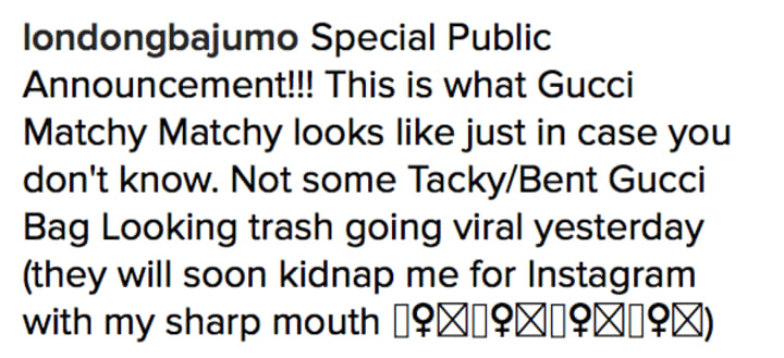 Not long after, a UK based personal shopper called Mercy out by showing what a real Gucci Matchy Matchy actually looks like.