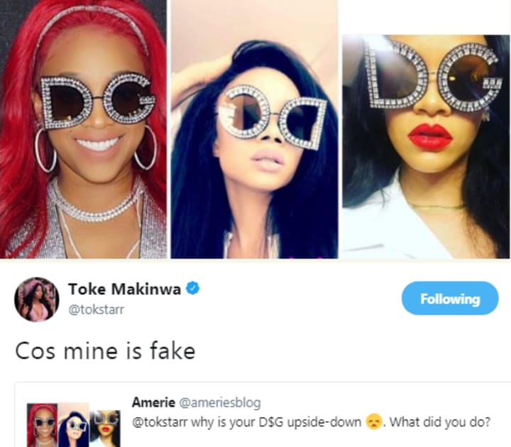 In another instance, Toke posted a picture rocking D&G eyeglasses that artistes like Rihanna had worn in the past. However, fans were quick to ask why hers were upside down to which she responded “Cos mine is fake”
