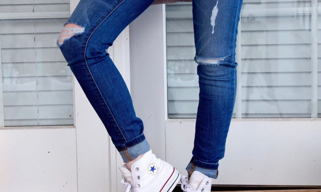 Distressed jeans go well with stilettos, you can fold twice from the bottom if you are wearing heels.