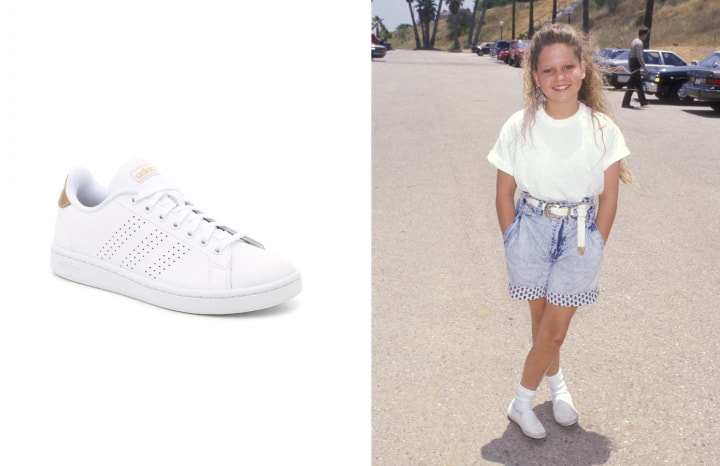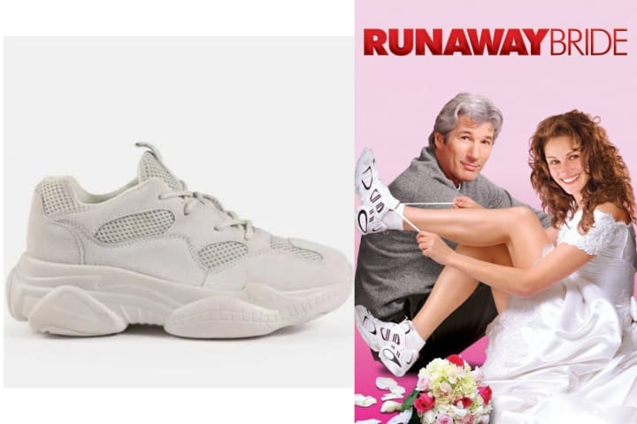Not unlike the ones Julia Roberts is rocking in the cover of "Runaway Bride." For a neutral look, try white or off-white. For a bolder statement, buy some loud and colorful kicks! Fila and Adidas have a ton out right now. Most people wear them with jogger-like sweatpants that cinch at the ankle. They fall under the athleisure category.