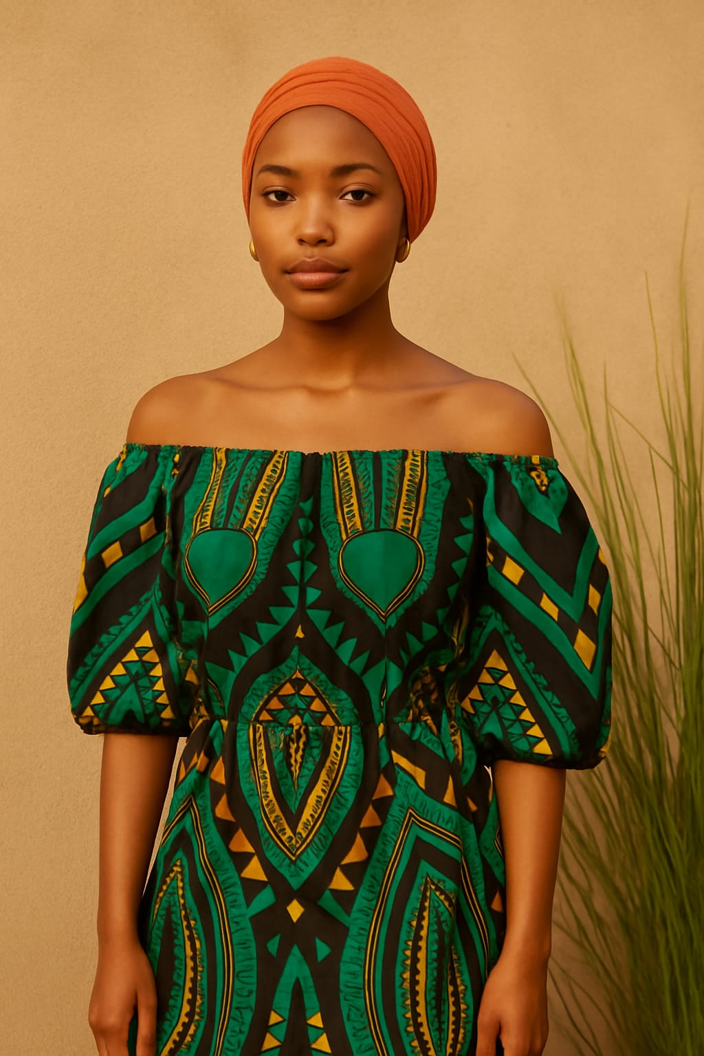Subtle African print scarf or earrings as cultural detail