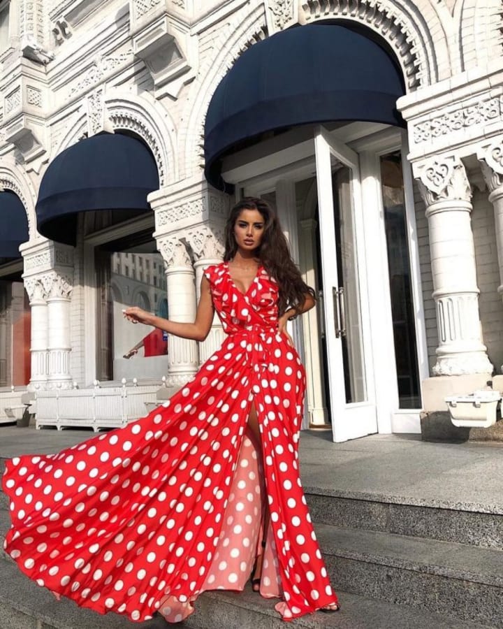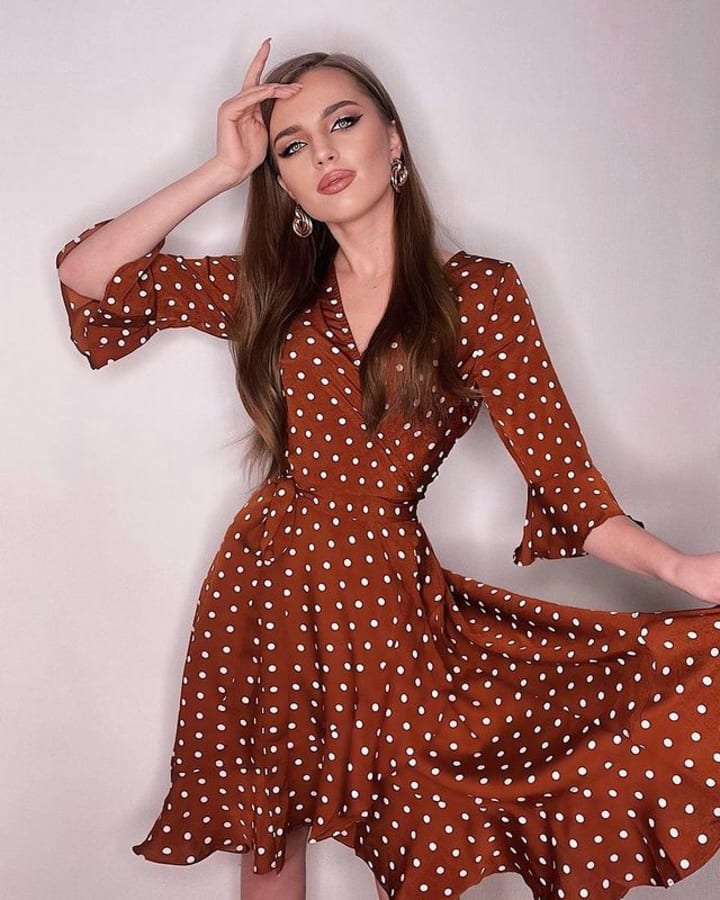 Polka dot dresses make a woman elegant and add a special retro chic to the look. Small peas, as a rule, slim, and large ones give a thin figure splendor and volume. If you chose the classic black and white version, then add red pumps and red lipstick to the look. You can't go wrong!