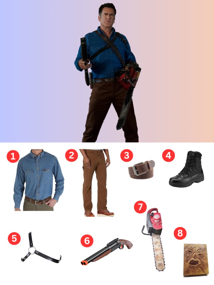 Start with the shirt and pants. Add the belt and boots. Strap on the harness. Grab the shotgun and chainsaw. Finally, toss the Necronomicon into the mix. Now you’re ready to fight Deadites at any Halloween party or cosplay event.