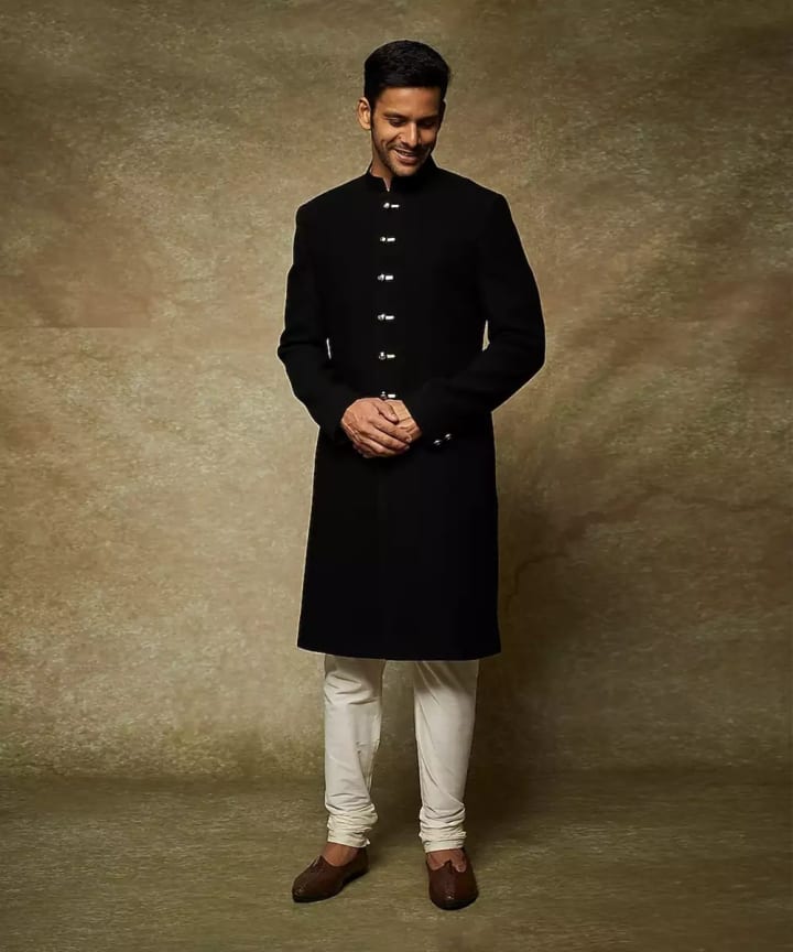 A Bandhgala suit, also called a Jodhpuri suit, is a high-neck, closed-collar outfit that gives a classy and sharp look. It usually comes with a tailored jacket and matching trousers. This style originated in Jodhpur, Rajasthan, and was once considered royal court attire. Today, it has become a favorite among men who want to make a bold yet traditional statement at weddings and festive events.