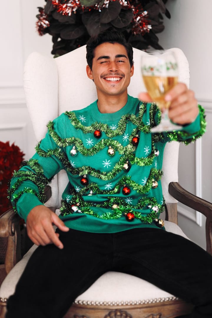 “Haul out the holly, because it's time to tinsel the crap out of your holiday wardrobe. This garland bedecked men's Christmas sweater is punctuated with baubles that shine and catch the candlelight in a nostalgic way that's almost enough to make your eyes tear up. Actually, this wonderfully tacky design will probably make a lot of people cry.”