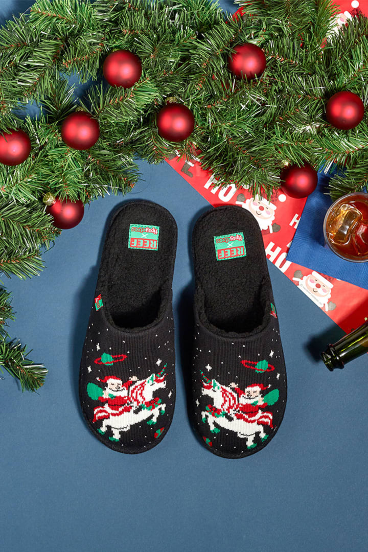 "All we’re saying is, nobody’s seen Santa and a Unicorn in the same room together. Nobody’s actually ever seen either of them, if we’re being honest. We’ve teamed up with REEF to take the world’s most favorite elusive creatures and bring them straight to your slippers. In a duo more rare than diamonds, you might want to hang on to these loafers."