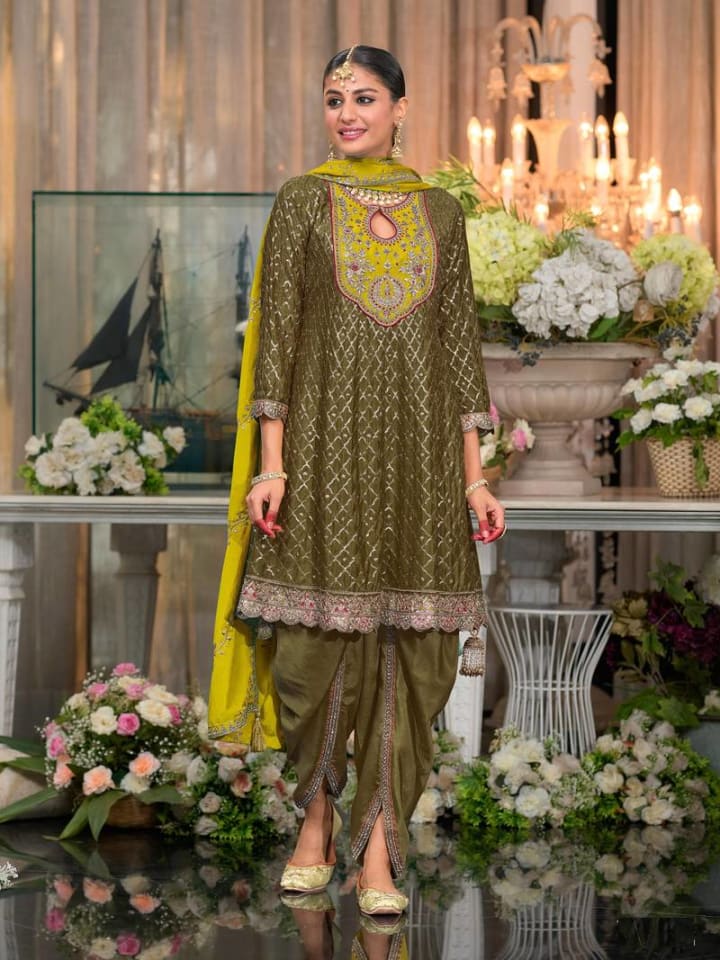 Punjabi salwar suits are often referred to as patialas. They come with a kurta or kameez with length up to the knee. The salwar is loose and has multiple pleats. Additionally, these bridal suits with heavy dupattas come in conventional colours such as gold. Nonetheless, modern-day brides experiment a lot with colour combinations.