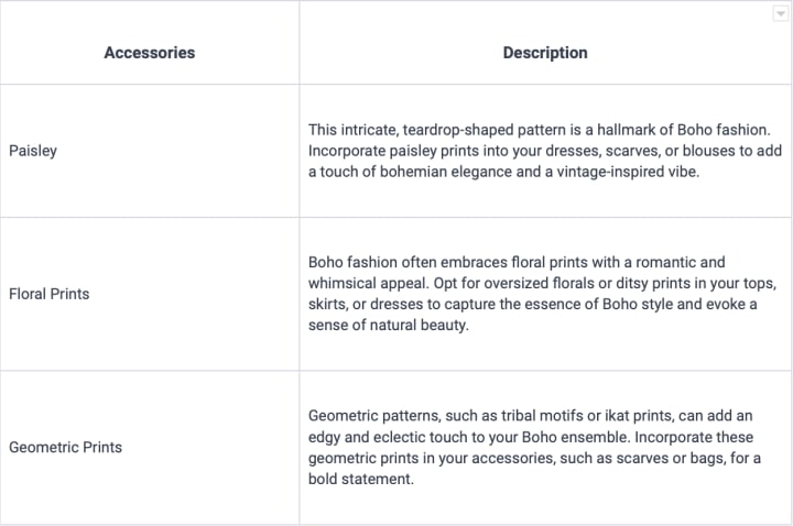 Boho wear thrives on playful patterns and prints that reflect its free-spirited nature. By incorporating these patterns into your outfits, you can infuse a delightful touch of Boho charm. Here are some popular choices: