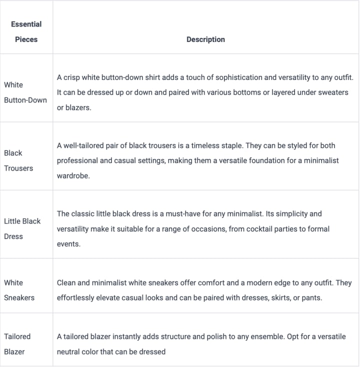 Minimalism favors a neutral color palette, including shades like white, black, beige, gray, and navy. These colors create a timeless and cohesive aesthetic, allowing for easy coordination and a sophisticated appearance. Opt for clean lines in your clothing choices, favoring simple and well-tailored designs that showcase the beauty of minimalism.