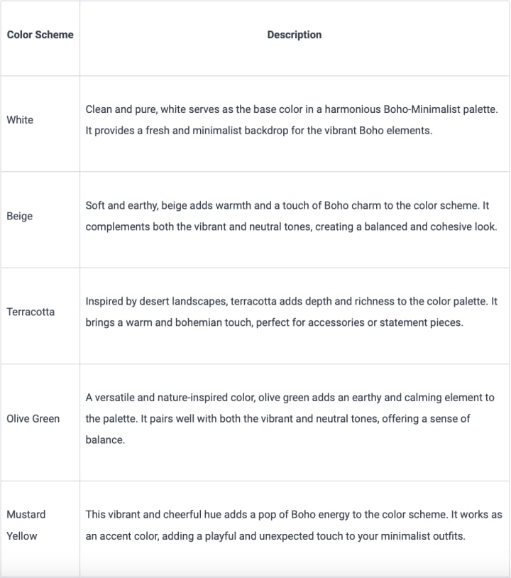 To achieve the perfect fusion, it's crucial to strike a balance between the vibrant elements of Boho style and the minimalist principles. While Boho fashion embraces eclectic patterns, bold colors, and layered textures, minimalism calls for clean lines, simplicity, and a decluttered aesthetic. The key is to choose statement pieces from the Bohemian realm and pair them with minimalist basics to create a cohesive and visually appealing look.