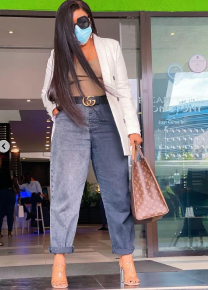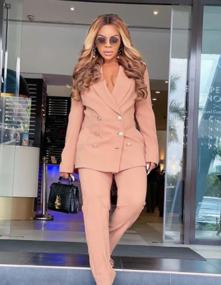 The day she rocked a YSL bag, nude color pant suit and a Kukus hair wig;