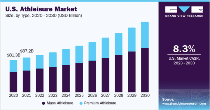 Between 2012 and 2019, the global athleisure sector increased by 42 percent with a total value of 270 billion dollars, and the growth of athleisure apparel is expected to grow by 30 percent by 2020.