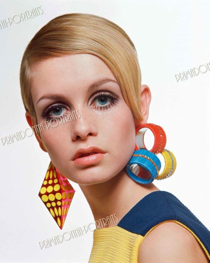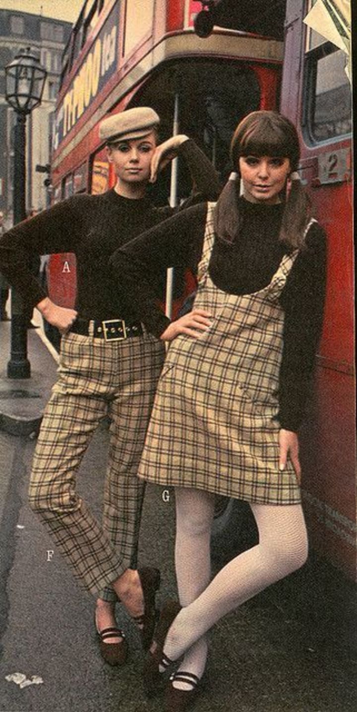 With the arrival of the swinging 60’s and London’s very first boutique shop opening on the infamous Carnaby Street, more feminine pieces were introduced into women’s clothing. Sleek lines and simple silhouettes were added into the mix. Drop waist jackets, bright colorful tights and short shift dresses in either bold colors & geometric designs or black & white optical patterns became household staples. The mini skirt popularized by designer Mary Quaint took the United Kingdom by storm as hem lines became shorter and shorter. Traditional womenswear continued to challenge tradition with full tailored suits, dungarees and breeches. Large plastic bracelets, flat shoes and knee high boots were compliments to women’s Mod fashion and the focus on makeup became eyelashes. While facial makeup was kept to a minimal, women were going crazy for false eyelashes inspired by an iconic model of the era: Twiggy.