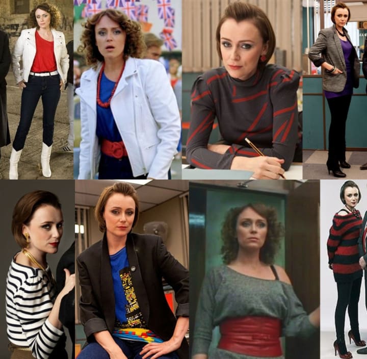 I’ll be basic here. I am besotted over how Keeley Hawes rocks the white. In place of the denim she uses her white jacket and white boots as a canvas for her stylish bright tops, often slipped loosely off one shoulder. Then, when she’s not in her white cropped coat she is combining the smart slick blazer with her casual under-layer. I struggle to find something to dislike about this sassy stylish look that is so incorporable to personal adaptations and tastes. It’s a fitting flair not only as a comprehensive outfit but a mixture of style and comfort. Even though she doesn’t represent the common baggy bottoms of the 80s, her slick flexible yet tight trousers worn alongside the colourful baggy tops is reflective of the start of the 80s fashion advancement, which also encompassed tight Lycra or Leather miniskirts – something you can see with Shaz’s attire.