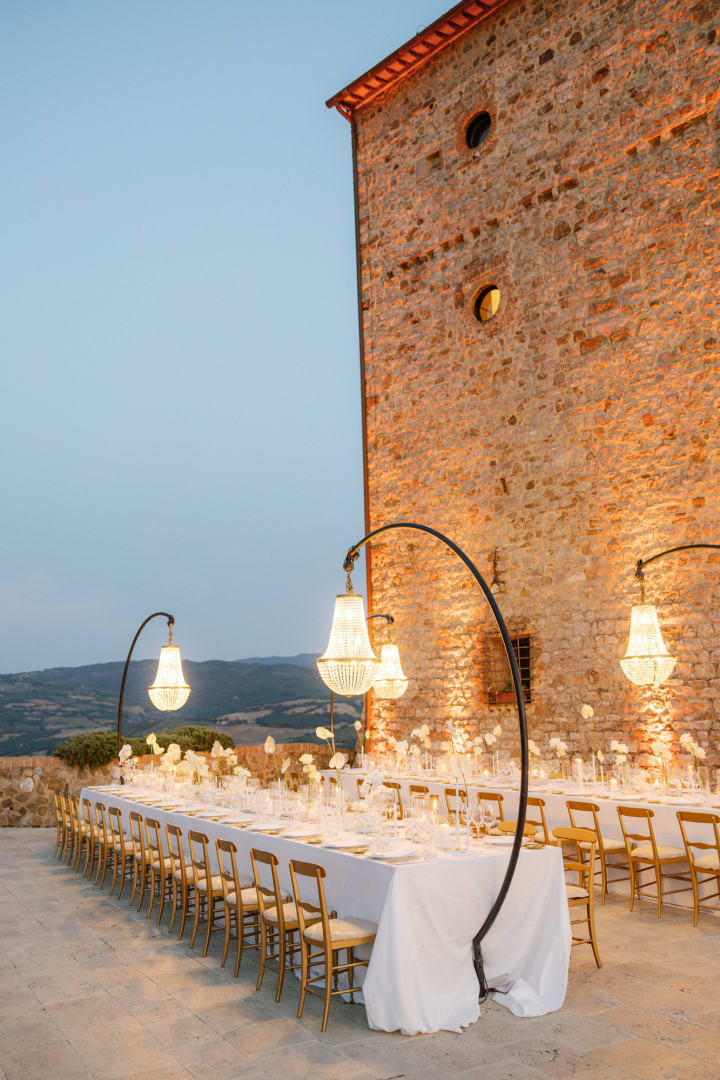 Castello di Velona: A new addition to our list, this restored 10th-century fortress in Montalcino offers a unique blend of history and luxury. Perched atop a hill overlooking the Val d'Orcia, the castle boasts thermal springs, a world-class spa, and breathtaking views of the surrounding vineyards. Its stone walls and elegant suites provide a perfect balance of medieval charm and modern comfort, making it an ideal venue for couples seeking a truly luxurious Tuscan wedding experience.