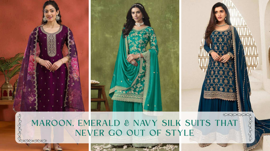 Maroon, emerald, and navy silk suits are timeless classics for a reason they exude luxury, stay elegant through the years, and make you look effortlessly put-together. Whether you’re dressing for a wedding, a festival, or a family celebration, these colours promise sophistication with ease.