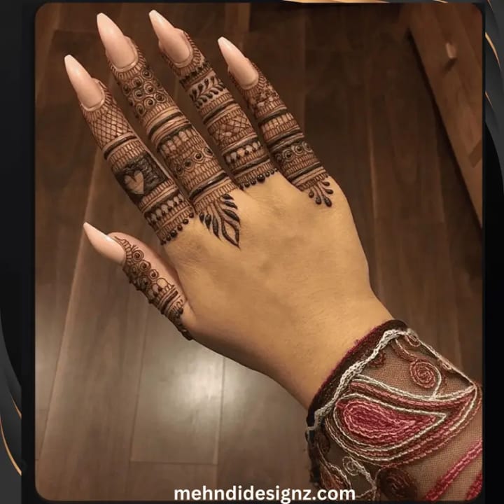 For brides who prefer a subtle look, small floral or paisley patterns on the fingers can complement a more elaborate hand design.