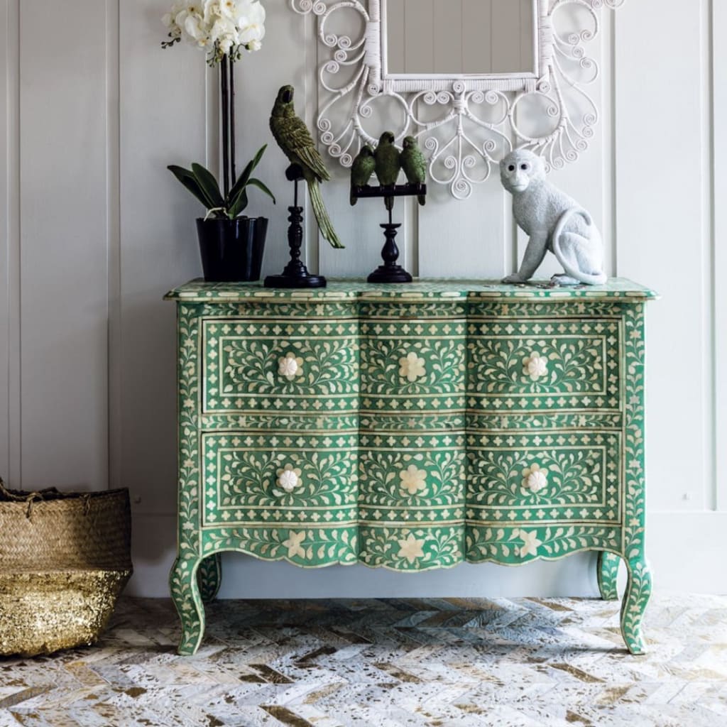 Mother of pearl furniture is renowned for its captivating beauty and luxurious appeal. Derived from the iridescent inner layer of mollusk shells, mother of pearl exudes an exquisite shimmer and opulence that is unmatched. Each furniture piece is meticulously adorned with hand-cut and hand-set mother of pearl pieces, creating intricate patterns and designs that catch the eye and elevate any interior decor.
