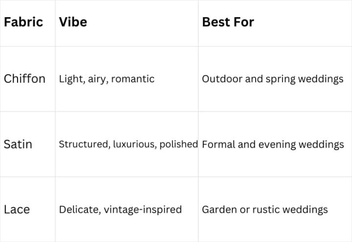 • Silk or satin for soft glamour