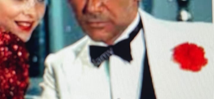 Indiana Jones and the Temple of Doom (1984) directed by Steven Spielberg and starring Kate Capshaw in one of the most fun red dress moments on-screen. She enters the scene through a smoking dragon tunnel that leads to an enormous stage where the chorus kickline goes on and on for the opening credits of this installment. She’s wearing a long, red, sequin backless dress, one red glove and one gold glove and Ferrari red lips singing ‘Anything Goes’. Don’t overlook Harrison Ford as Dr. Jones in this scene either, his white tux and red rose boutonniere is so sexy and so sharp and would look fabulous on anyone - whether you’re the center of attention or complimenting your date with a red flower pinned to your lapel.