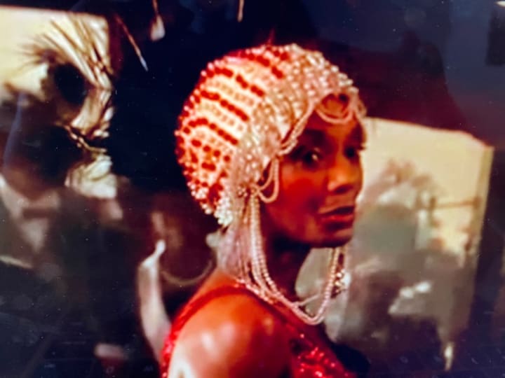 The Color Purple (1985), Tata Vega singing in red beads, sequins, pearls and feathers as Shug Avery in this Academy Award winning film directed by Steven Spielberg. Aggie Guerard Rodgers also designed the costumes for this film, which won her an Oscar in 1986. The draped pearls on this headdress are my favorite part. This should be a reminder that even with a fully beaded or sequined number like she wears here, singing ‘Sister’ to Whoopi Goldberg as Celie Johnson, you can still go all out with pearls (and feathers) if you want. I don’t think you can be too bold in red if you focus on the total look. You can still match shoes and lips here too and it would only sharpen the ensemble.