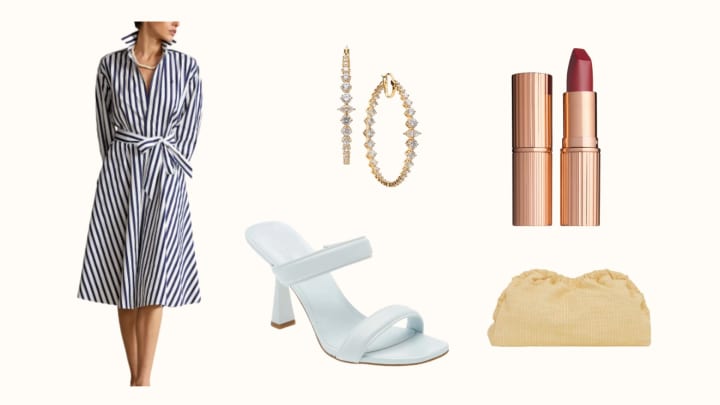 Striped Dress / Heels / Lipstick / Earrings / Handbag