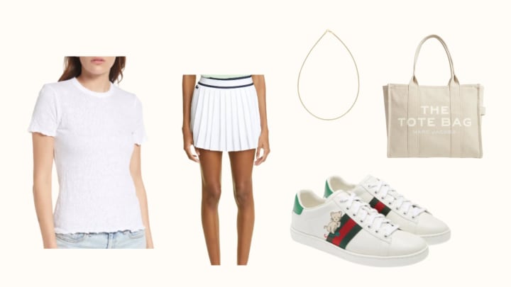 Tennis Skirt / White Tee / Sneakers / Chain / Tote Bag