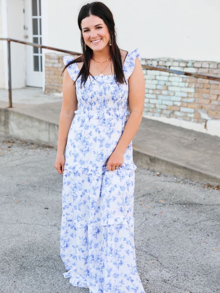 Maxi dresses are a must-have in any mother's wardrobe. They're comfortable and elegant and can be dressed up or down depending on the occasion. The pretty blue color of this dress will compliment any skin tone, while the ruffled strap sleeves add a touch of femininity.