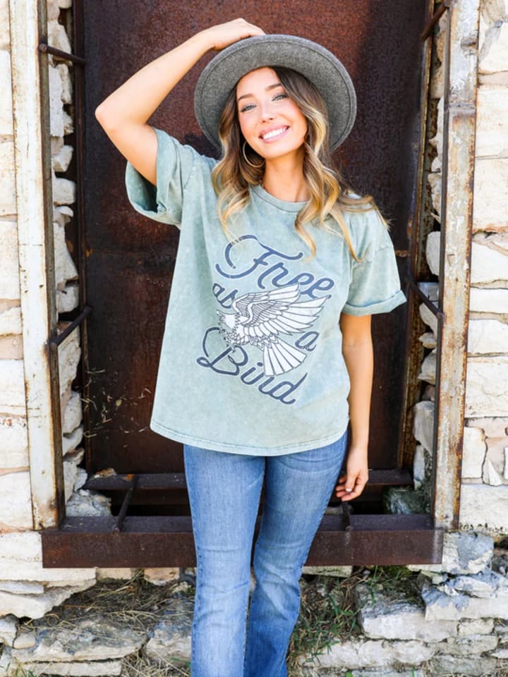 Graphic tees are all the rage right now, and what better way to show your mom some love than with a shirt that celebrates her motherhood? This "Free as a Bird" tee is perfect for any mother who loves nature. The blue jeans keep the look casual, while the sneakers add a touch of sportiness.