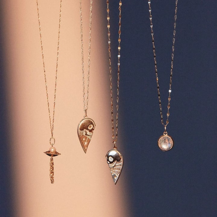Bridgers worked with the jewelry brand to make two small but impactful charms: a small moonstone charm with her lyric “I’d give you the moon,” scrawled in her own handwriting on the back, and a pearl spaceship with tractor beams made of teensy chains.