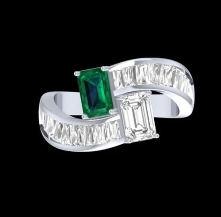 This Diamond Ring has a brilliant appearance on hand. In this ring, two Emerald Diamonds(Natural) are used for a brilliant appearance. The first Emerald Diamond has 2.84 Carats, and the Second Emerald weights 2.88 Carats. Both emeralds have Green and White colors (Now Called As Colorless).
