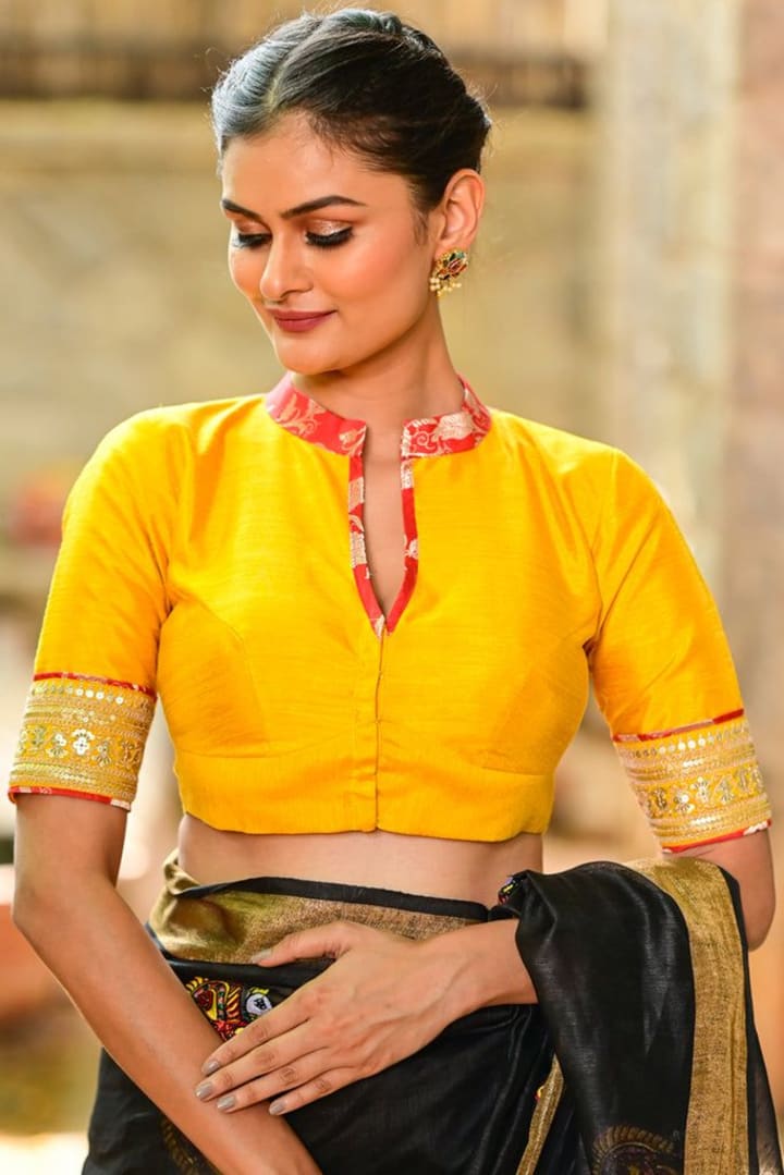 The stand collar blouse is designed with a stiff neckline that gives a structured look. Perfect for modern and experimental styling, this design pairs beautifully with high-waisted sarees or contemporary drapes. Choose contrasting piping or embellishments to enhance the beauty of the collar.