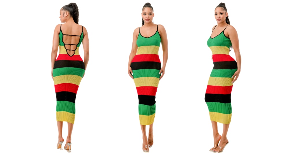 The combination of the seductive open back, the vibrant Rasta color scheme, and the luxurious ribbed knit fabric creates a fashion-forward ensemble that is both empowering and elegant. It's a dress that demands attention and celebrates your inner beauty, allowing you to radiate confidence with every step.