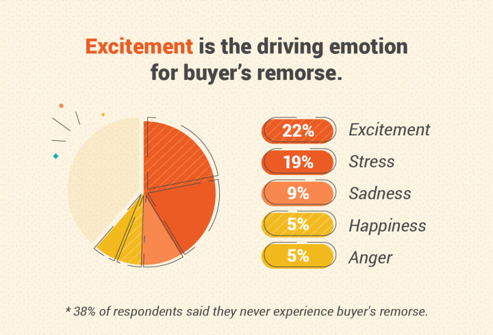 According to our respondents, excitement is the leading cause of overspending and making purchases shoppers later regret. More than 22 percent of Americans named this emotion as their top influencer. Overall, 62 percent of respondents blamed some emotion as being responsible for purchases they later regret.